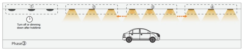 1. Group1センサーが車などのモーションを検出すると、次のGroup2がアクティブになるため、Group 1とGroup2がオンになりますが、他のグループはまだオフになります。 3つのセンサーと3つのライトが1つのグループでプログラムされているため、これら2つのグループの合計6つのライトが同時にオンになります。