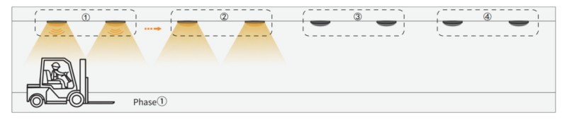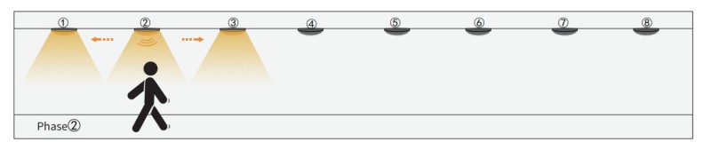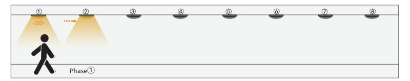 1. Group1センサーが動きを検出すると、次のGroup2がアクティブになり、Group 1とGroup2がオンになります。ただし、残りのライトはまだオフです。
