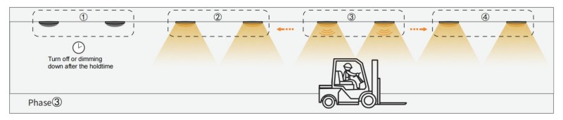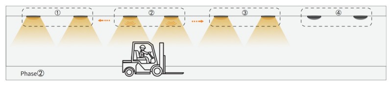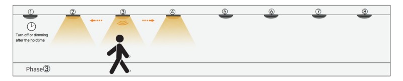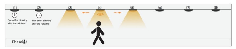 3.グループ3を通過すると、グループ3センサーはグループ2とグループ4に隣接します。他のグループはオフのままです。その後、グループ1は、モーションセンサーが長い間RF信号を受信または検出しないため、オフまたは薄暗くなります。