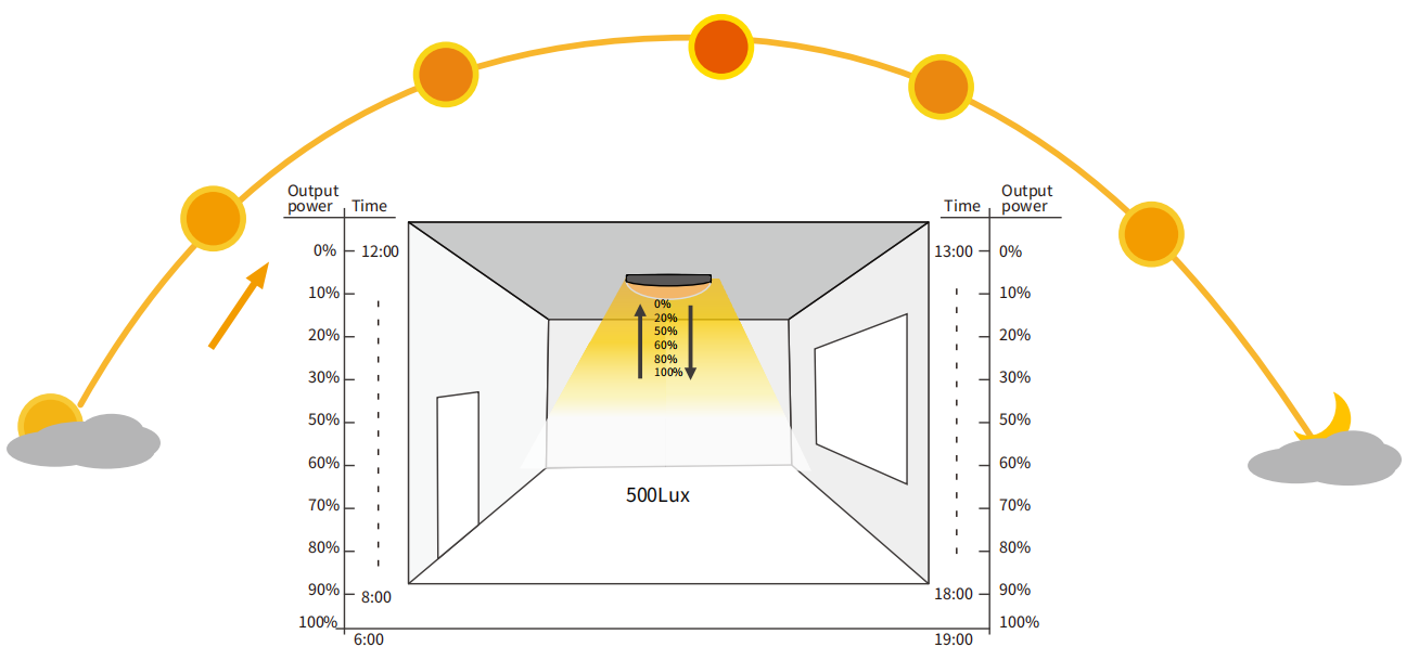 センサーが自然光を検出すると、照明が暗くなり、照明器具は以下のように出力を調光します。